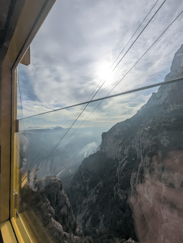 To get to the Monastery of Montserrat you must take a train out of Barcelona. It’s about an hour and a half journey, the roofs and spires of the city progressively fading into fields and hills. We stepped from the train almost directly into a yellow cable car that slowly threaded us high into the domed mountains towering around us. There we were, a dozen tourists (pilgrims?), dangling together in gentle ascent, the bald mountains crowded around us like faceless heads of Easter Island. At that hour, clouds still lurked around the peaks like smoke.